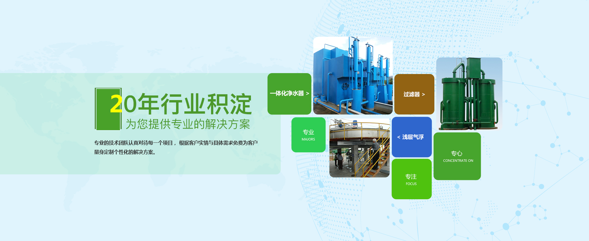 20年專業技術,超5000家客戶體驗證明,產品遍布全球50多個國家,專注20年,只做好一件事,專業處理各類型污水、中水、給水、化水保持100%的達標。